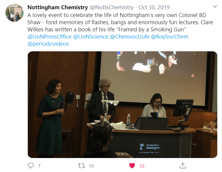 Huge thanks to Nottingham University School of Chemistry for hosting my launch event last week – it really did go with a bang! And what a privilege to share a stage with Prof Sir Martyn Poliakoff, Prof Pete Licence, Jim Gamble, Dr Sam Tang and Neil Barnes. More pics to follow.
