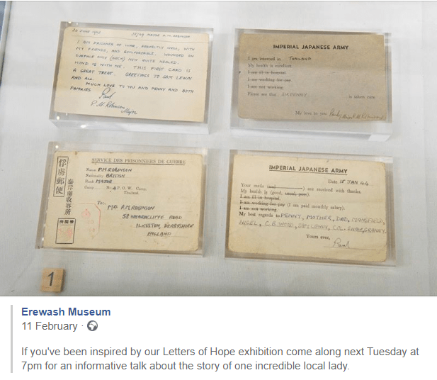 Hope Robinson was the wife of Brian’s second-in-command in Normandy in 1949, Paul Robinson. In many ways Brian was fortunate to fall into German hands, as Paul Robinson and the rest of the battalion were posted to the Far East, captured, and endured much worse conditions. Hope drew attention to their plight and gave great comfort to their families by writing to them with information they wouldn’t otherwise have received. This exhibition is well worth a visit and I’m sure the talk will be fascinating.