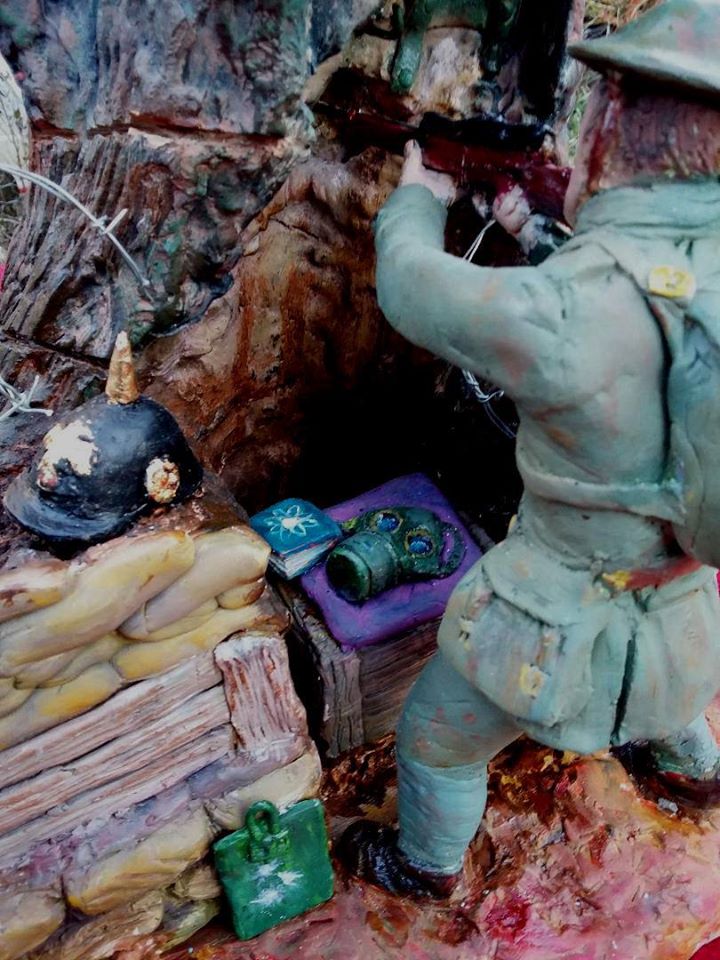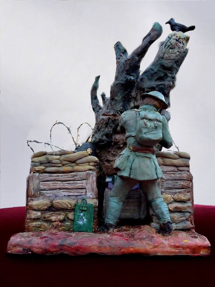 Love this sculpture by artist and sculptor Tim bennett fine art of BD Shaw manning his lookout post in the trenches of World War I. Created for an exhibition in Ilkeston and going on permanent display at Nottingham University. Fantastic attention to detail, with a science textbook at his side!
