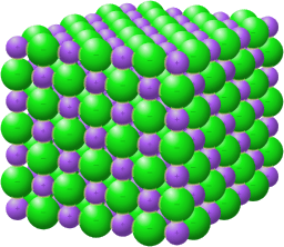 The cubic structures of table salt crystals result from their atomic arrangement where each positively charged sodium ion is surrounded by six negatively charged chloride ions, and vice versa, as shown in the diagram.