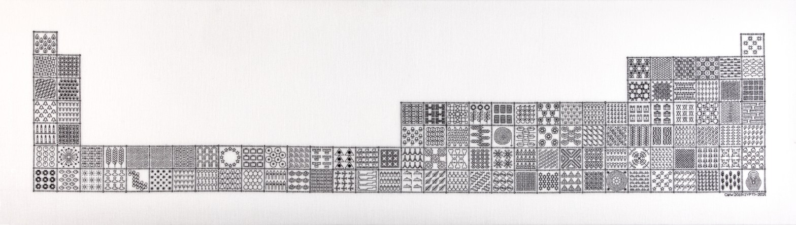 So here it is, all 118 elements, a different and relevant pattern for each. I must admit that when I started out I never imagined I would be able to find a meaningful pattern for every element. The initial plan was simply 118 different blackwork patterns, perhaps incorporating a few of Dalton’s symbols. It wasContinue reading “Complete”