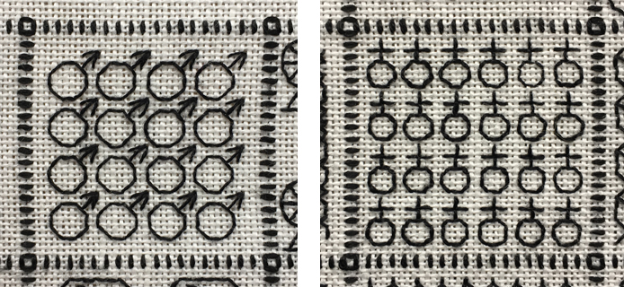 Iron is the last of the seven metal elements known since antiquity that I have stitched, the others being gold, silver, lead, mercury, copper and tin. Iron was linked to the god Mars, bringer of war; its alchemical symbol is thought to derive from a shield and spear and is the symbol we now useContinue reading “Alchemical symbols”